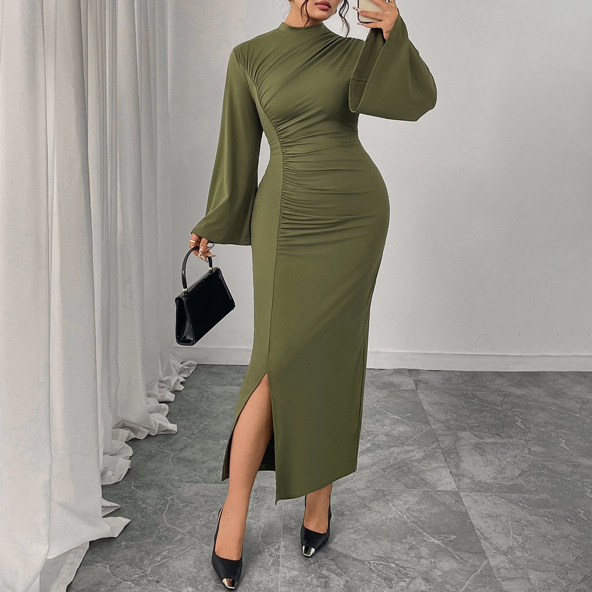 This dress is not only stylish but also versatile for various occasions. Whether it’s a casual outing or a night out, the solid color and sleek design make it a must-have in your wardrobe.