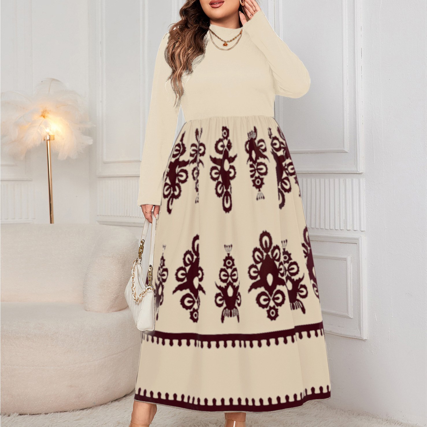 This beautiful high-waisted floral maxi dress is perfect for elegant casual outings. Made from high-quality polyester, it offers both comfort and style. The dress features a semi-high neck and long sleeves, making it a versatile addition to your wardrobe. Available in classic color options, this dress is designed to flatter all body types with its relaxed fit.