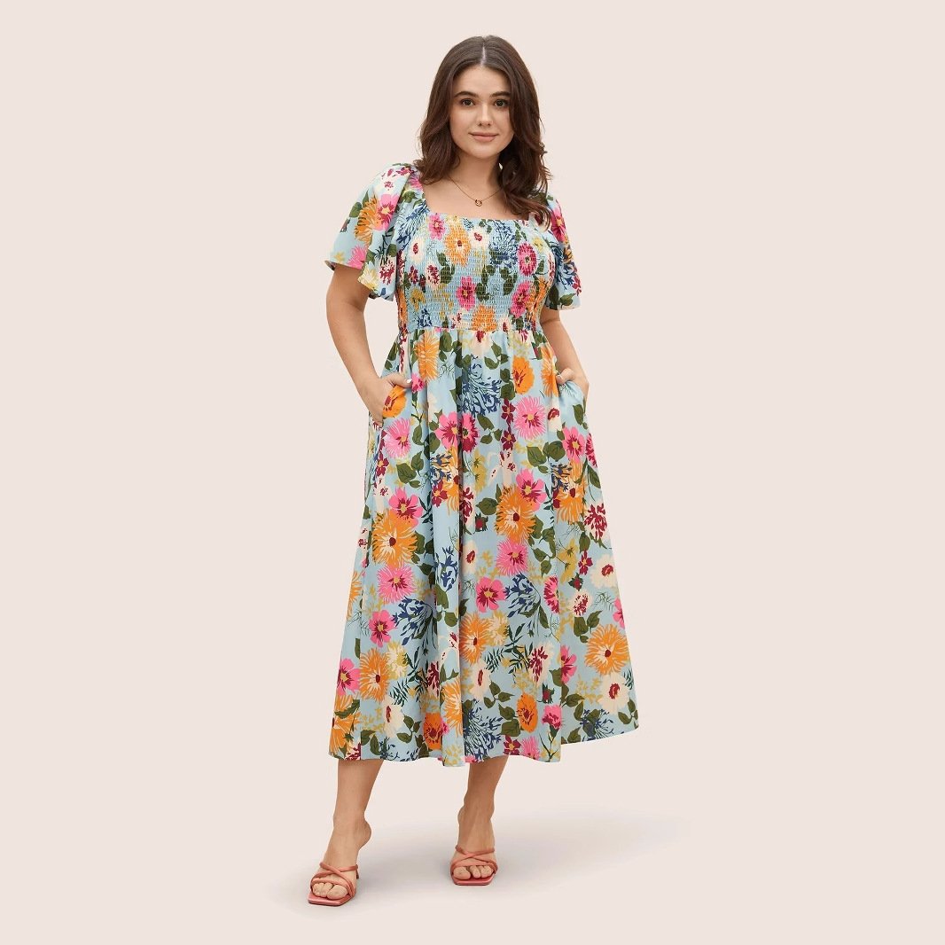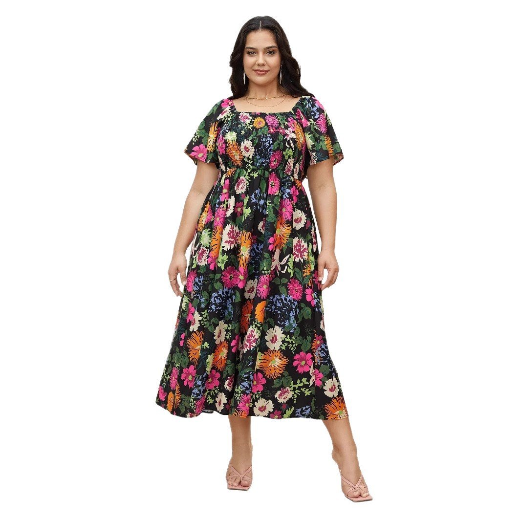 This elegant A-line maxi dress features a flattering square neckline and short sleeves, perfect for a chic and comfortable casual look. Made from high-quality polyester fabric, it ensures a soft feel and durability. The dress showcases a trendy floral pattern, making it ideal for various occasions.