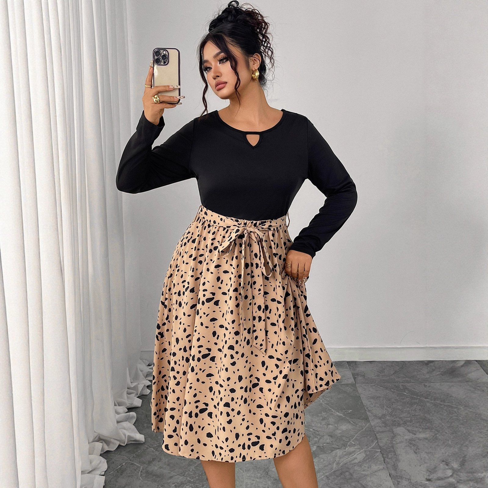 Experience effortless style with our Plus Size Leopard Print Long Sleeve Dress. This stunning piece features a round neckline and is perfect for casual outings or relaxed gatherings. Designed with both comfort and fashion in mind, this dress is a must-have for your wardrobe.