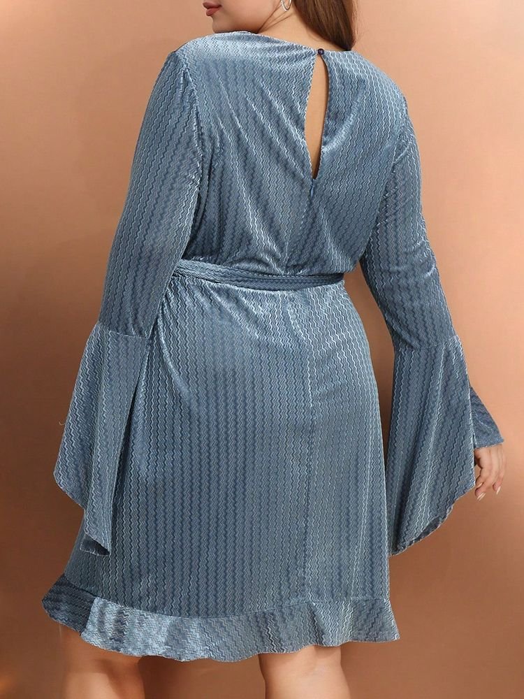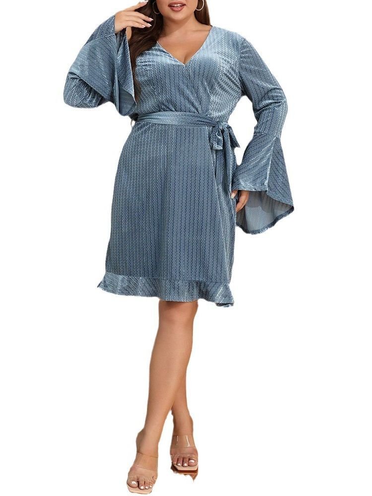 This elegant plus size dress is perfect for all occasions, combining comfort and style effortlessly. Made from a soft polyester fabric with a touch of spandex for added stretch, it offers a flattering fit for all body types. The V-neckline and flared long sleeves add a sophisticated touch, while the solid color ensures versatility for dressing up or down.