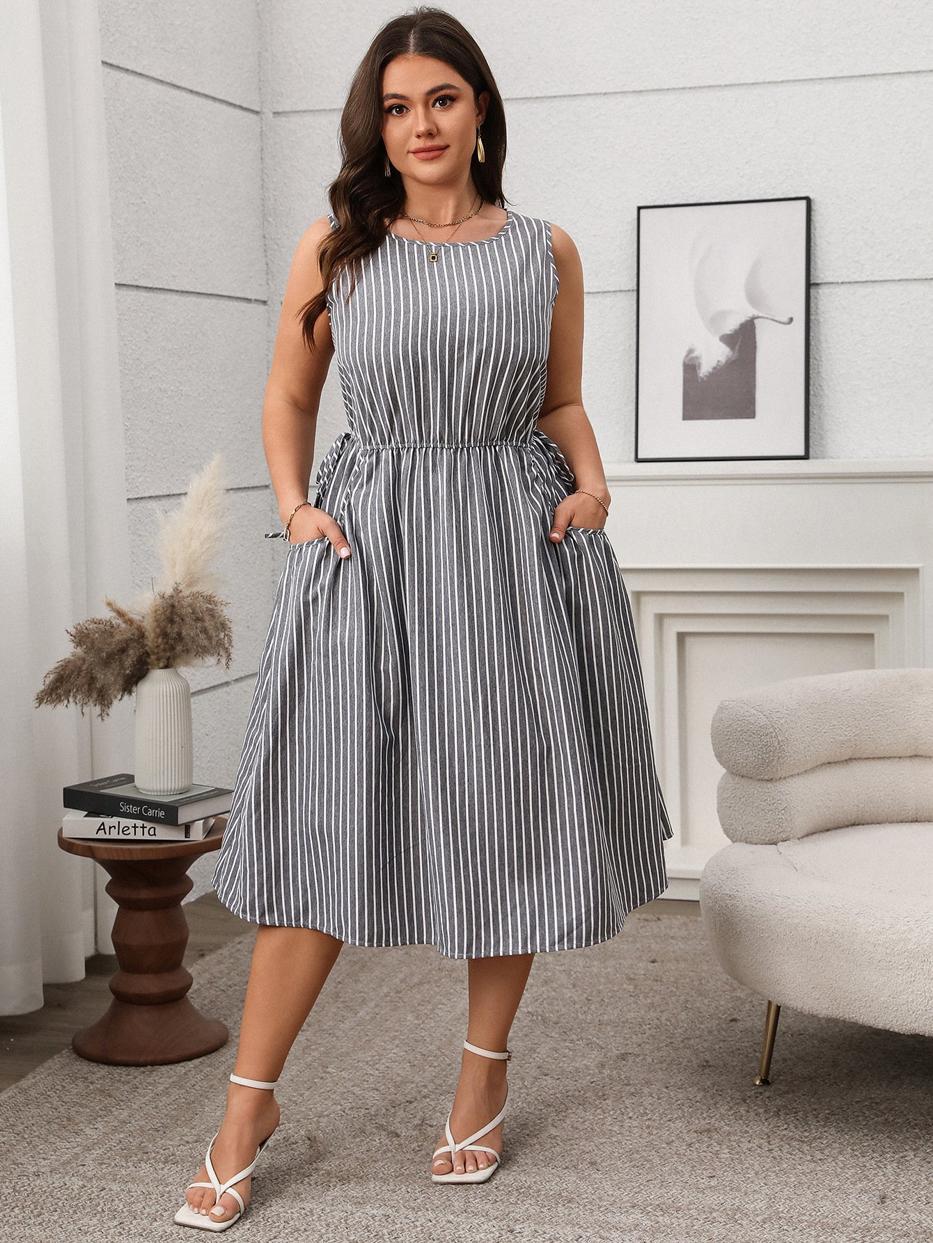Made from high-quality polyester, this fashionable midi dress features a chic striped design and practical pockets, making it perfect for everyday wear. The A-line silhouette flatters different body types, while the sleeveless style keeps you comfortable during warm days.