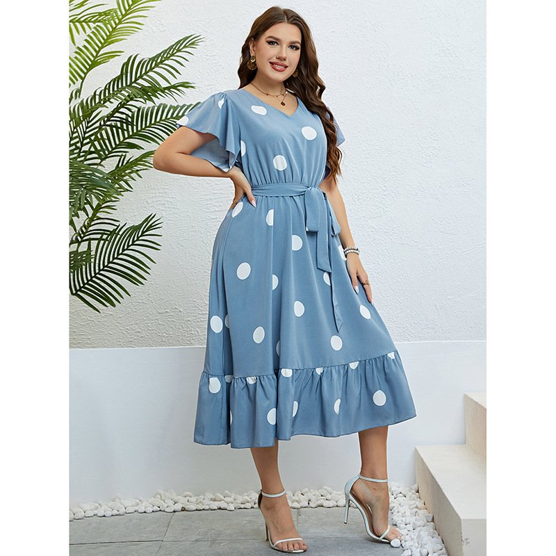 This stylish V-neck dress features a flattering tie waist design, perfect for a chic summer look. The cute polka dot pattern adds a touch of fun and femininity to your wardrobe. Made from high-quality polyester, this dress offers comfort and durability for everyday wear. Its A-line silhouette and ruffled sleeves create a fresh, sweet look that complements various occasions.