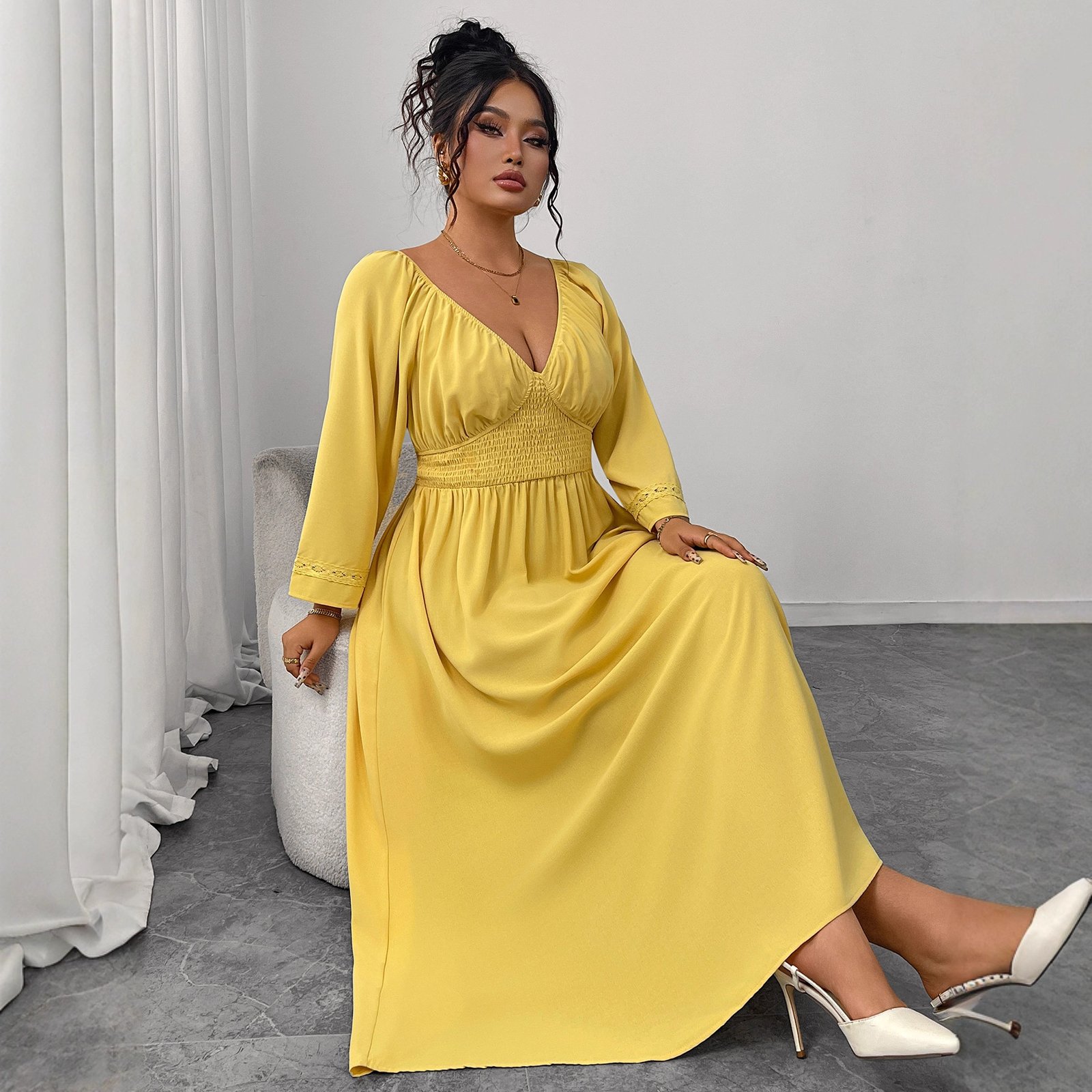 This stunning yellow dress features a deep V-neckline and an elegant high-waisted design, perfect for making a statement at any event. Crafted from high-quality polyester, it offers a comfortable fit while enhancing your silhouette. The dress is available in various sizes, ensuring a flattering look for everyone.